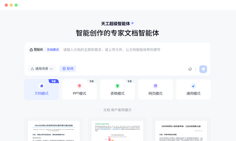 Skywork天工超级智能体的核心亮点之一,是其面向办公各类任务所提供的“专用型智能体”组合。每一个智能体对应一个细分应用场景,具备相应的专业能力与内容输出格式。用户可根据任务类型,直接调用相应的Agent,获得结构化、可用、可导出的内容成果。这种高度任务导向的设计,极大提升了AI在实际工作流中的实用性和落地率。
